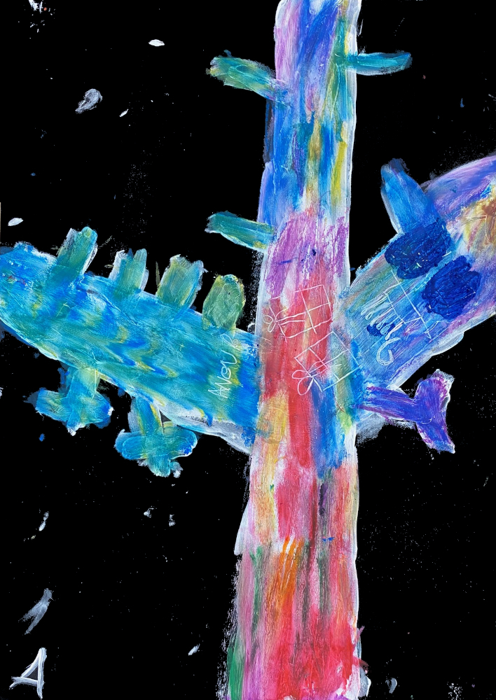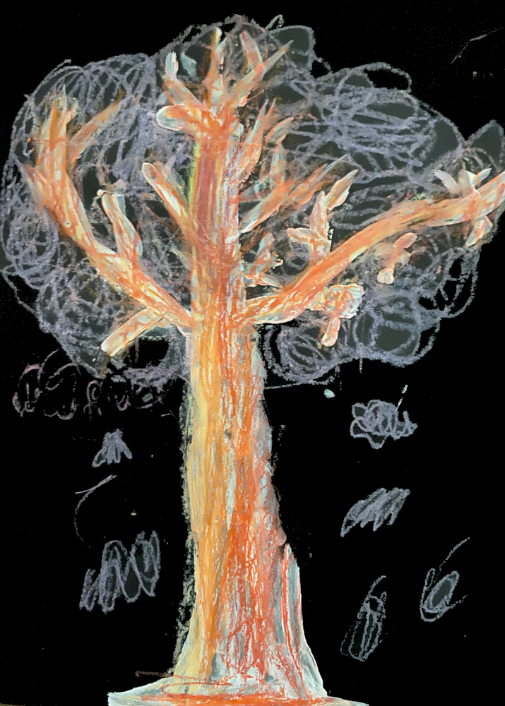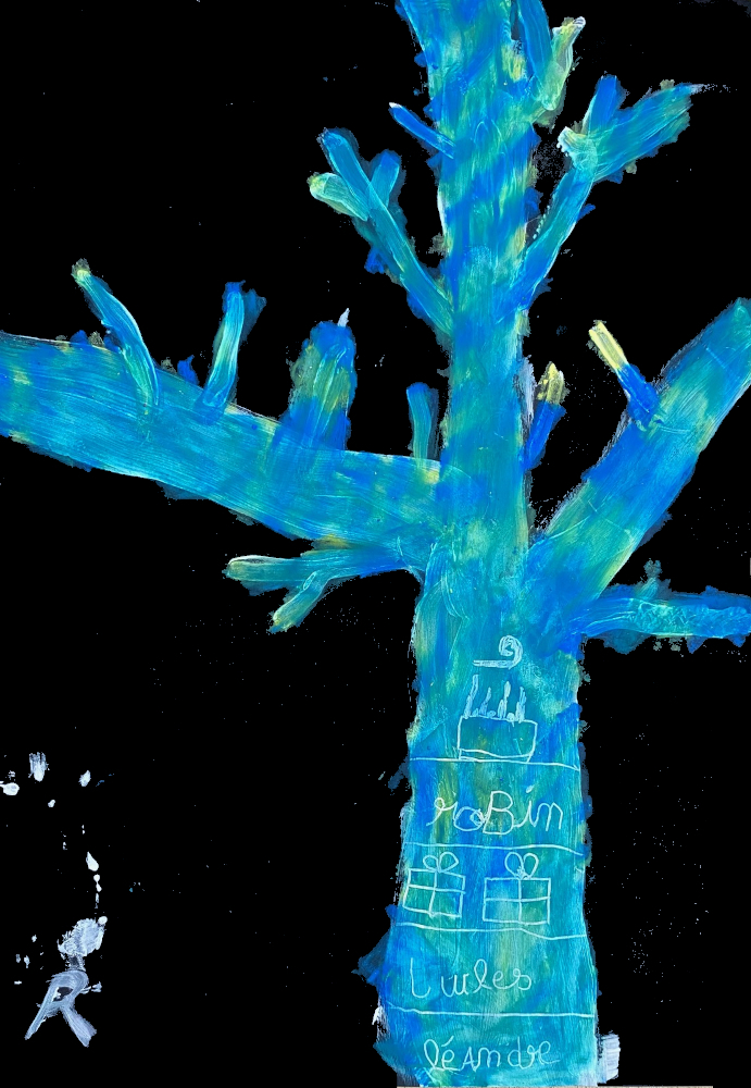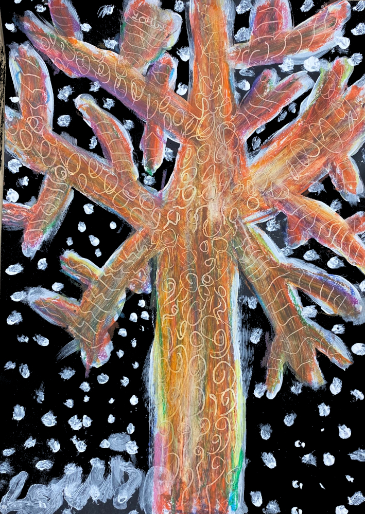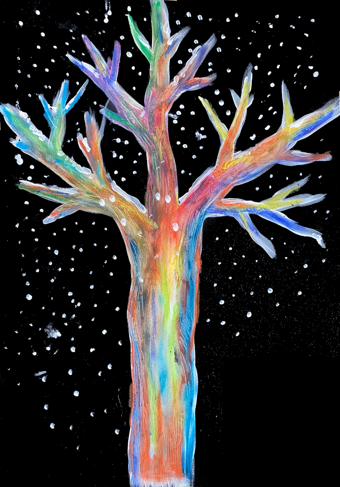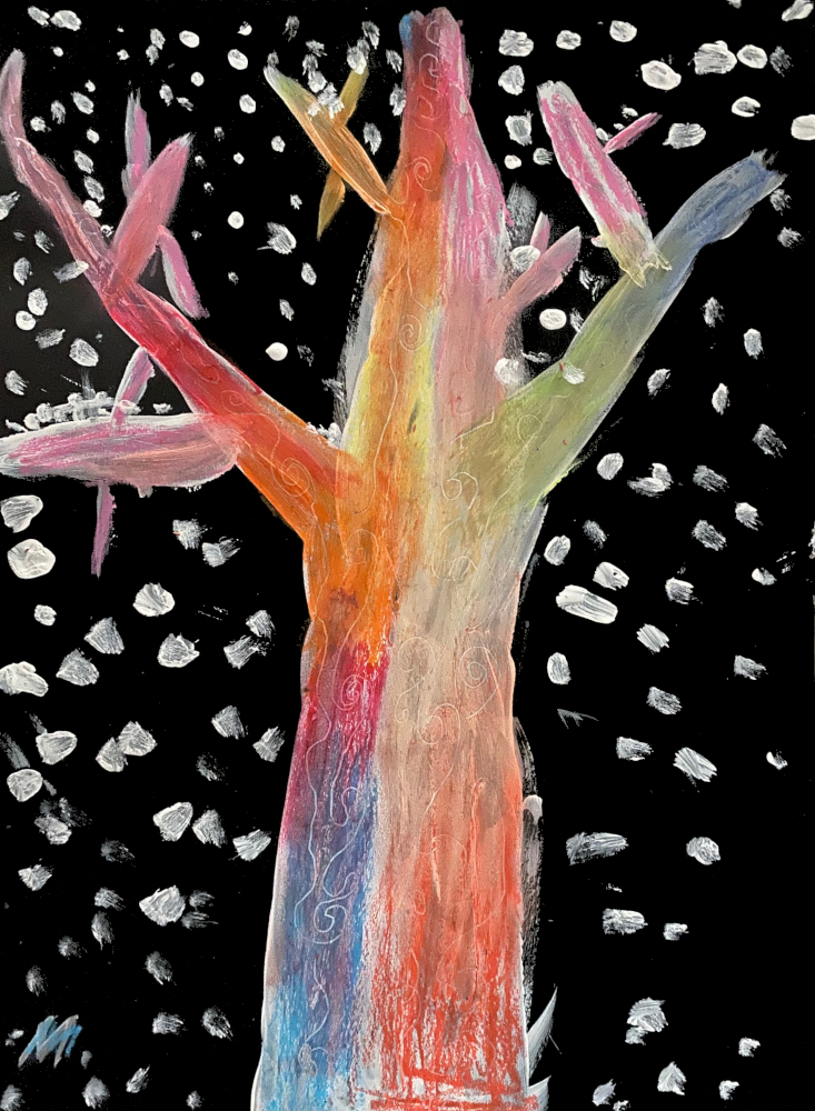 Le tronc des arbres est parfois très coloré. Nous avons peint nos arbres sous la neige à l'acrylique blanche puis les avons colorés aux pastels avec la contrainte de ne pas utiliser le marron!