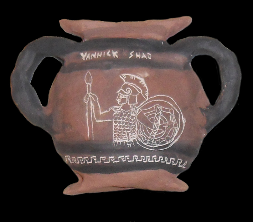 Sur un vase en argile, des motifs sont gravés puis peints. Scènes inspirées de l'Odyssée (Polyphème le cyclope se fait crever l'oeil par Ulysse et ses hommes)